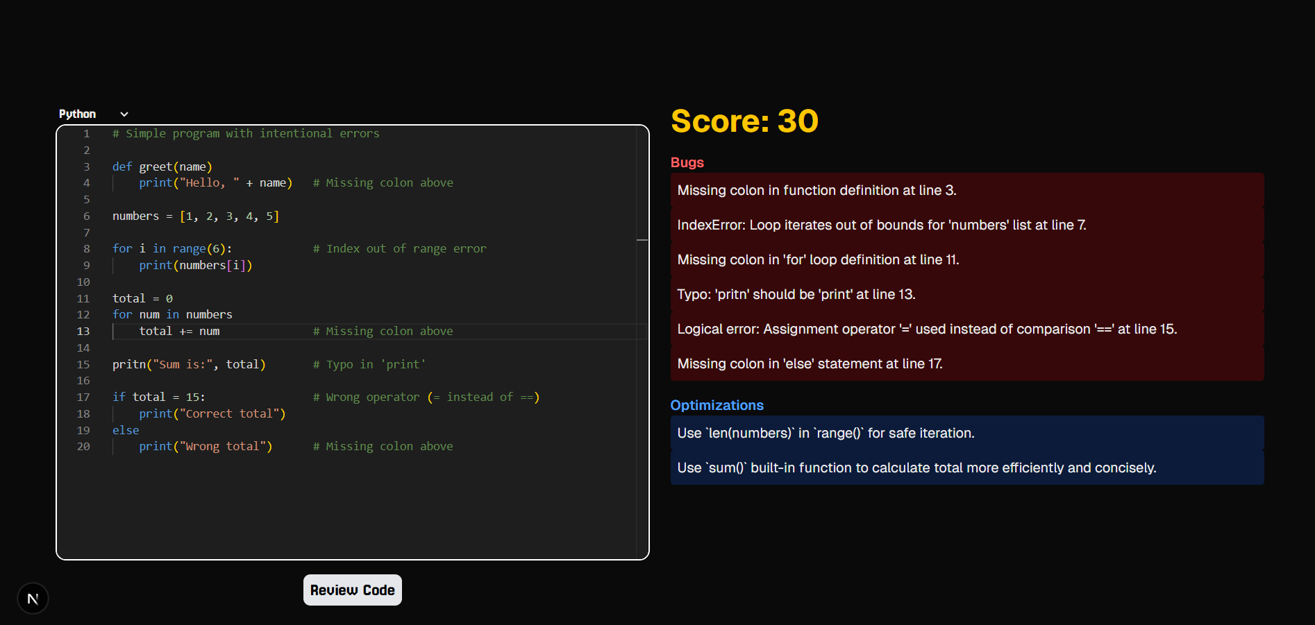 Paste your code. Get actionable feedback on bugs, performance, and best practices.